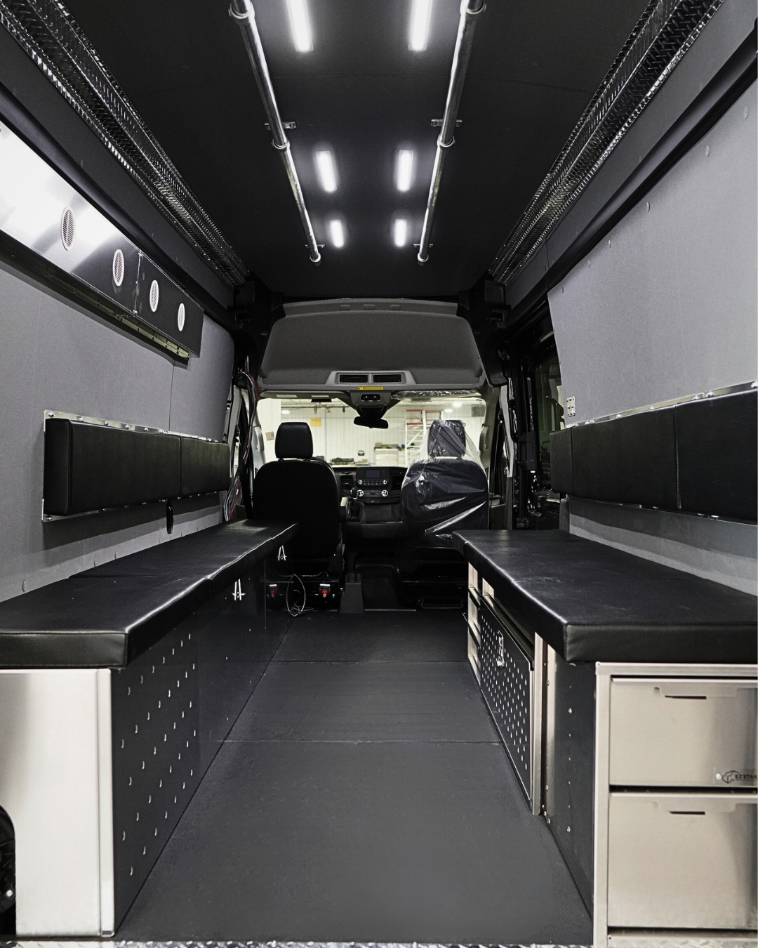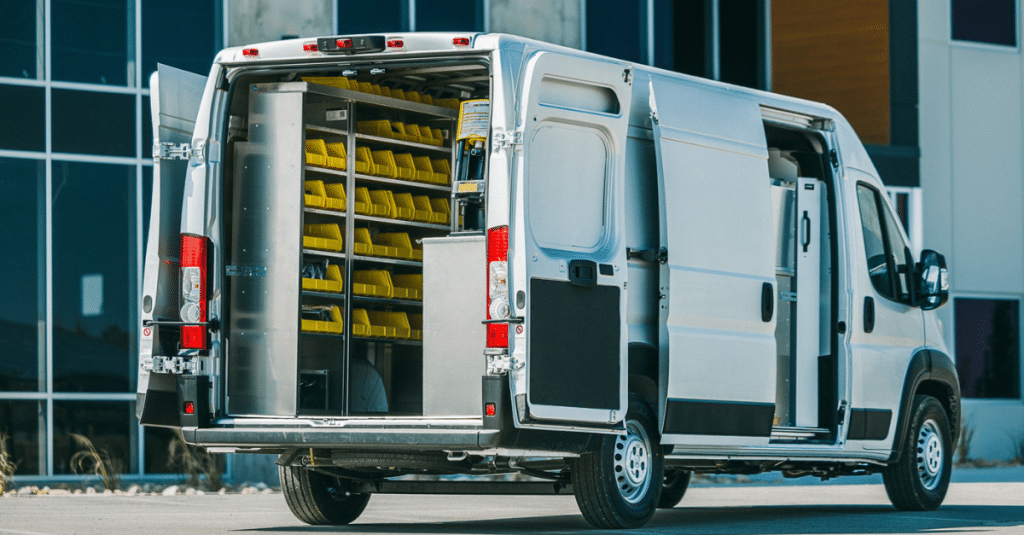 Standard interior shelving and cabinets, as well, rear and side door storage solutions, making it easy to access equipment and tools without climbing in the van.